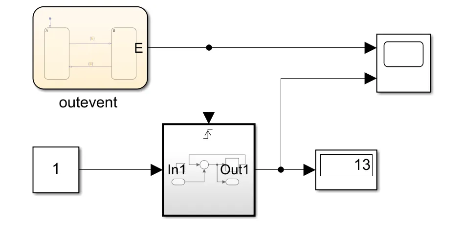 stateflow可以输出事件,也可以输出事件去触发simulink模型的执行,如下模型: