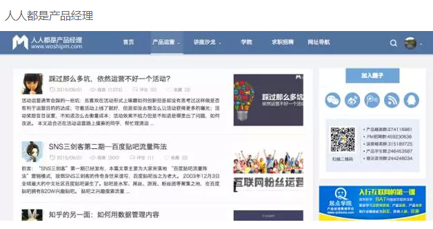人人都是产品经理是一个专门面向产品经理、运营人员等互联网从业人群的学习、交流和分享平台,网站上有丰富的产品和运营方面的干货知识,运营人员和产品经理可以在里面学习其他人分享的干货知识,也可以将自己做运营和产品的经验分享给他人。