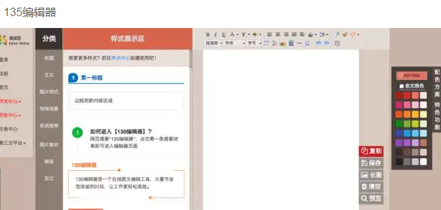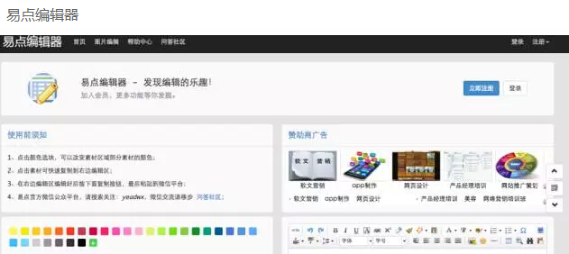 易点编辑器也是一款编辑排版工具,使用方法也非常简单:点击颜色选块,改变素材区域部分素材的颜色,点击素材可快速复制到编辑区,在编辑区将内容编辑排版好厚,再复制粘贴到微信平台即可。