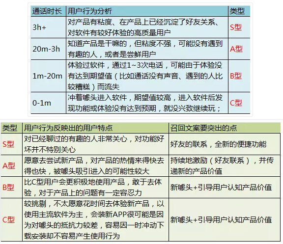 所以我们先把目光聚焦在用户行为上。统计分析“已流失用户”行为数据发现,每个用户的注册时间、通话频率、好友数量都大相径庭,背后隐藏的流失原因、对产品的兴趣点可能完全不同。因此若不能基于某一维度对用户做分类,就无法对不同类型的客户输出有针对性的召回短信文案。