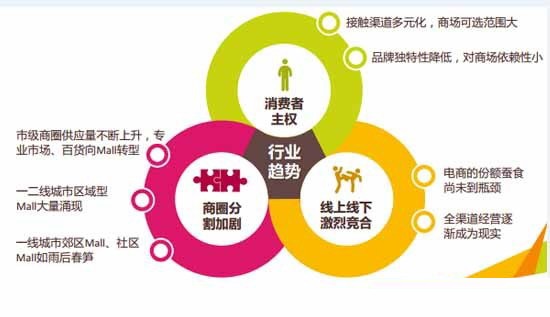 2、消费者选择的多样化,市场分割的加剧,线上线下的渠道融合合,都将对购物中心运营产生巨大压力。