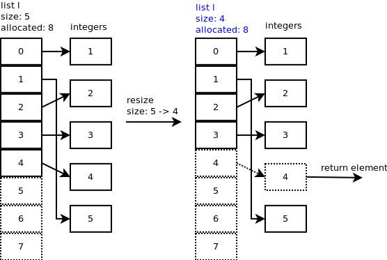 可以看到 pop 操作后槽空间 4 依然指向原先的整数对象,但是最为关键的是现在列表的大小已经变为