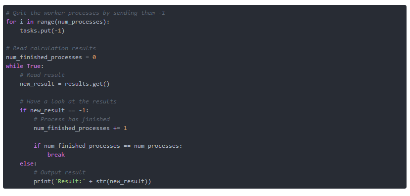 在主循环中,我们从该队列读取,并计数-1。 一旦我们计算了我们有过程的终止确认数量,主循环就会退出。 否则,我们从队列中输出计算结果。