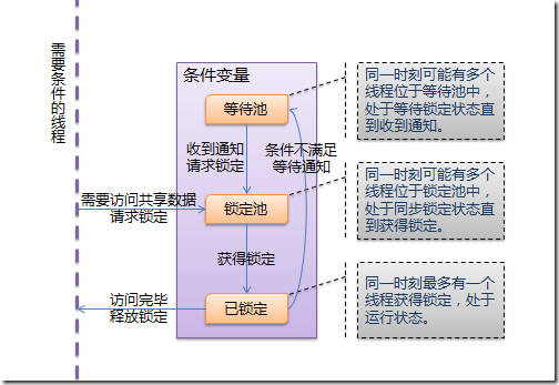 等待阻塞是指等待其他线程通知的状态,线程获得条件锁定后,调用“等待”将进入这个状态,一旦其他线程发出通知,线程将进入同步阻塞状态,再次竞争条件锁定;