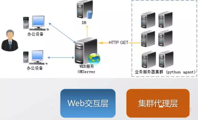 1)、第一层:即为WEB交互层,典型的B/S架构,以供管理员操作的交互平台,也是OMServer的核心,基于Django开发;