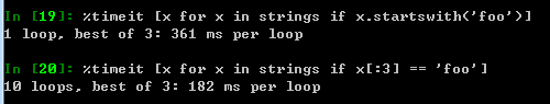 例子:下面是一个拥有60万字符串的数组,以及两个不同的“能够选出其中以foo开头的字符串”的方法: