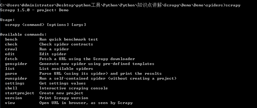 在终端中输入 scrapy,可以查看所有可执行的命令,现在我们来具体看一下这些命令