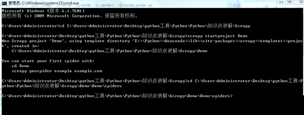 (1)我们要在spiders文件夹中创建爬虫程序,但是现在的当前文件是Scrapy,所以我们要先改变当前文件位置至spiders中