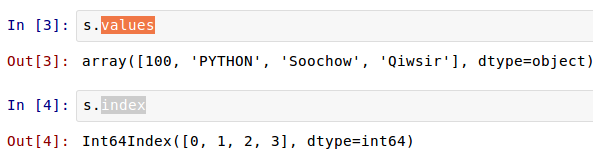 这里,我们实质上创建了一个 Series 对象,这个对象当然就有其属性和方法了。比如,下面的两个属性依次可以显示