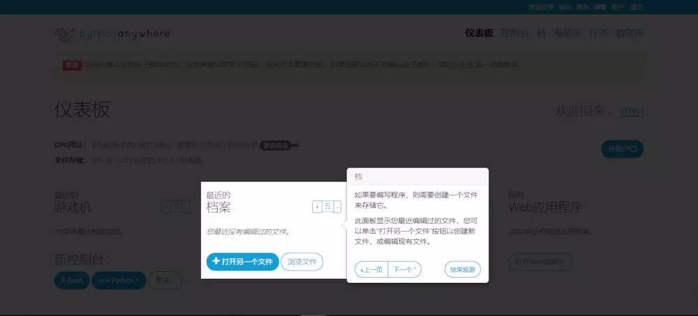 建好后千万不要按绿色大按钮,因为我们还没有告诉pythonanywhere代码是多少,暂时不要运行