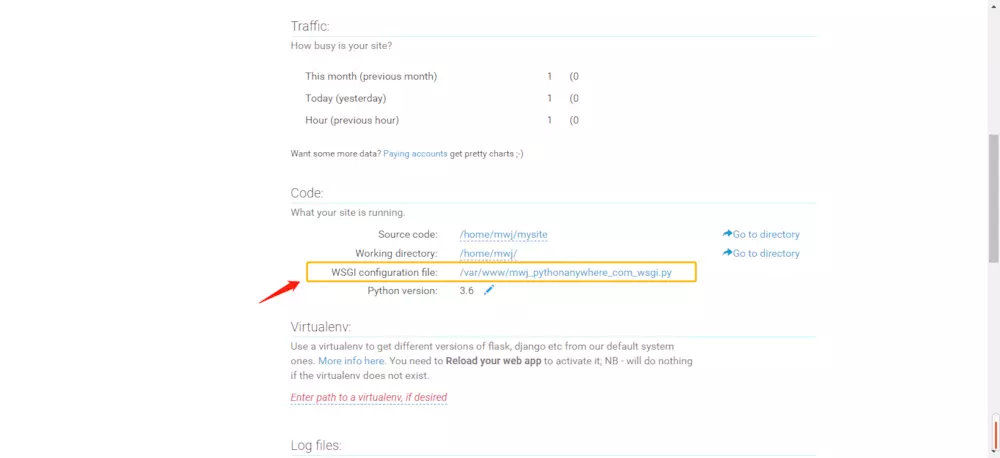 往下翻页找到Code下面的WSGI configuration file 标签右边的长链接,其它所有代码行都不理,单击这个长连接链接,这个长连接会把你新创建的Flask