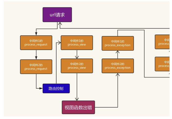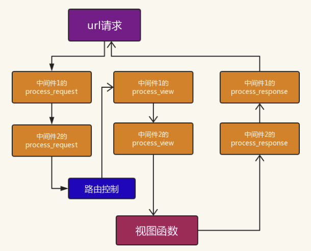 当最后一个中间的process_request到达路由关系映射之后,返回到中间件1的process_view,然后依次往下,到达views函数,最后通过process_response依次返回到达用户。