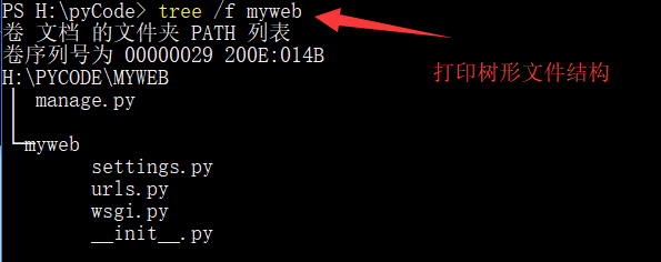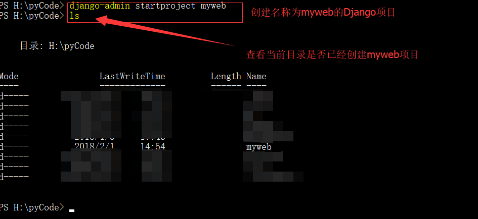 这时,我们可以看到,在我的 H:\pyCode 目录下多出一个文件夹 myweb,表示项目创建成功。