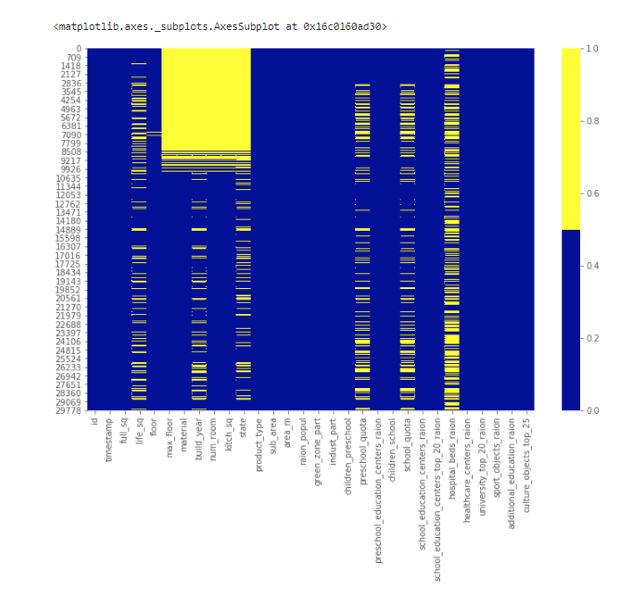 具体来说,我们看到特征life_sq缺失了21%的数据,特征floor则只缺失了1%。这个列表是一个较为有用的汇总,根据它就可以补充热图可视化了。