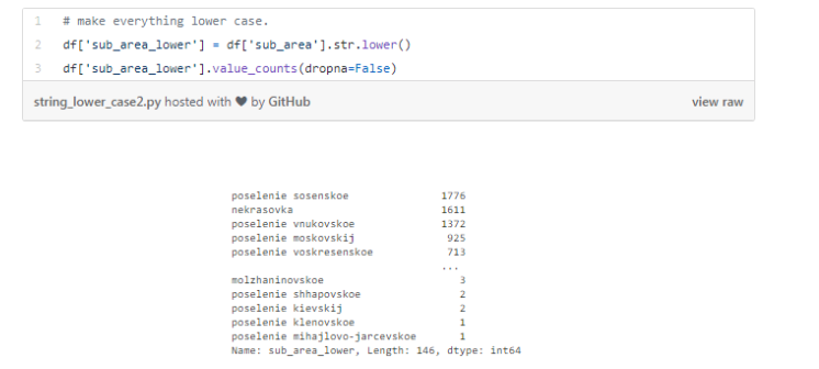但是,有时候在同一个特征数据中存在着大小写不一致的情况。举个例子,“Poselenie Sosenskoe”和“pOseleNie
