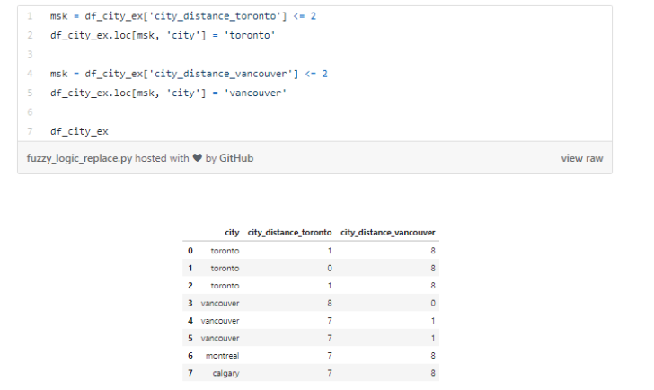 我们可以设置一个标准将这些错误的拼写转换为正确的值。例如,下面的代码将距离“toronto”2个字母以内的所有值都设置为“toronto”。