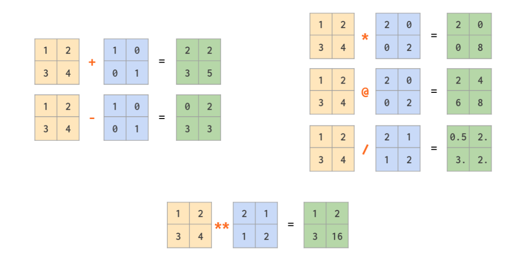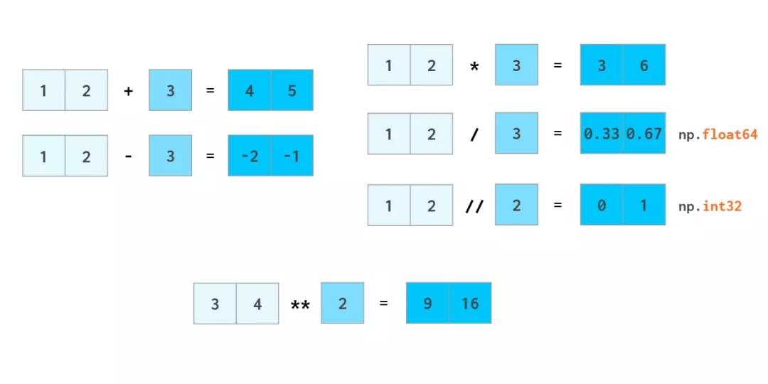 NumPy允许像普通数字一样操作整个数组(加减乘除、整除、幂):
