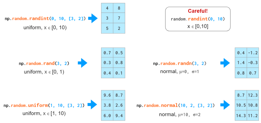出于测试目的,通常需要生成随机数组,NumPy提供随机整数、均匀分布、正态分布等几种随机数形式: