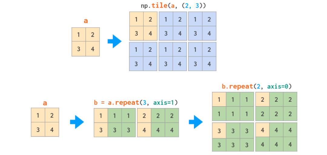 矩阵可以通过两种方式完成复制:tile类似于复制粘贴,repeat类似于分页打印。