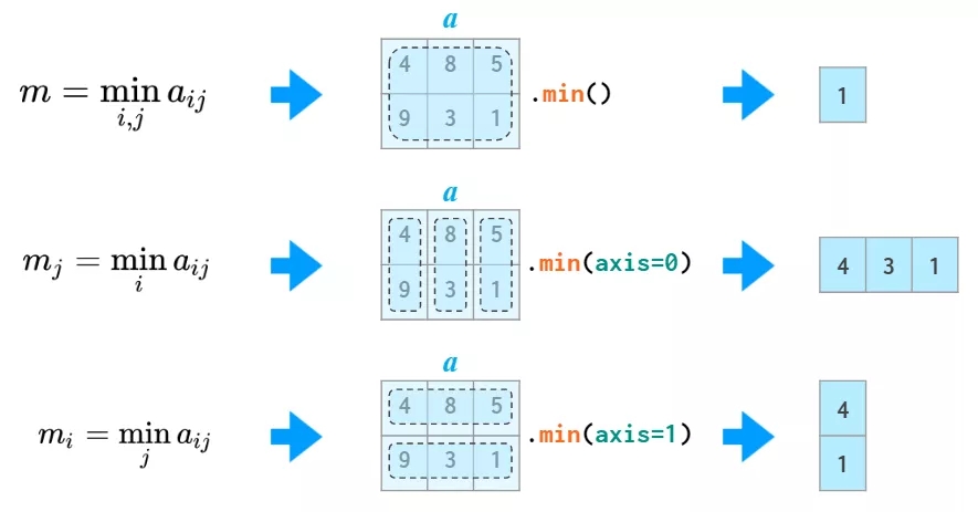 在许多操作(例如求和)中,我们需要告诉NumPy是否要跨行或跨列进行操作。为了使用任意维数的通用表示法,NumPy引入了axis的概念:axis参数实际上是所讨论索引的数量:第一个索引是axis=0,第二个索引是axis=1,等等。
