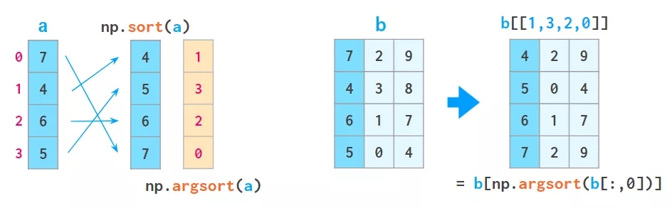 1、按第一列对数组排序:a[a[:,0].argsort()]