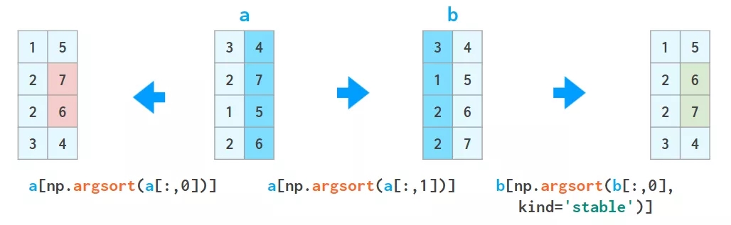 a[np.lexsort(np.flipud(a[2,5].T))]:先通过第2列排序,再通过第5列排序;