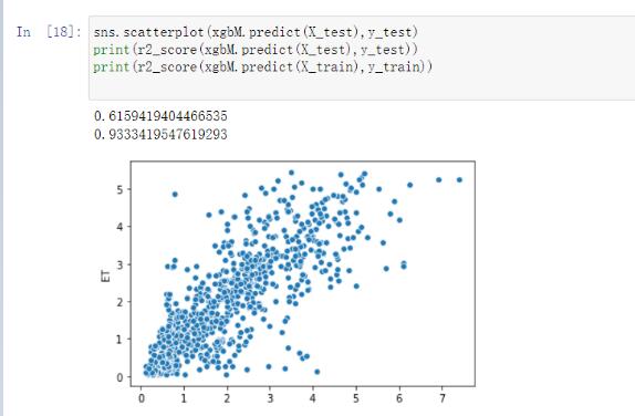 将测试集输入到训练好的模型中,计算出y值,并绘制散点图,计算模型在训练集和测试集上的R2(拟合系数)。