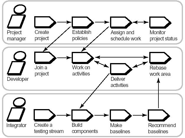 ClearCase 项目,并为这些项目设置关于如何管理变更的策略。开发者的职责是完成并交付工作活动,包括在源代码控制下变更文件和目录,并对这些变更进行单元测试。集成者的主要职责是接受开发者交付的活动,为交付了活动的各种组件创建新基线,根据新基线构建组件,为新基线安排测试,然后在测试完成后马上提升新基线。