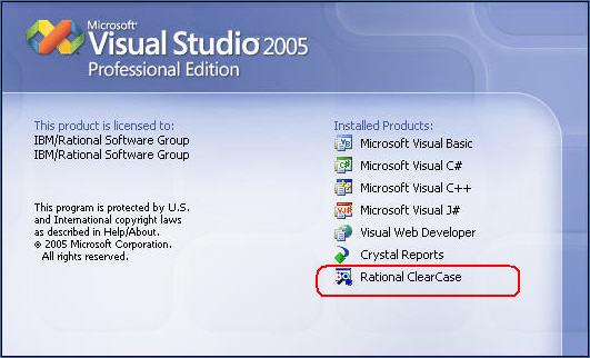 我们可以在安装ClearCase的时候同时选中ClearCase Client for VS2005选项,使之与ClearCase一并安装。CC.Net并不是一个独立的产品,它是做为一套组件而出现的,安装后,CC.Net是一组动态链接库。ClearCase是CC.Net的后台,可以看作是一个引擎,有了ClearCase的驱动,CC.Net才能在VS2005中正常工作,所以CC.Net的运行必须有ClearCase做支撑,也就是说ClearCase应首先安装。选中CC.Net组件之后,就可以进行ClearCase随后的安装,ClearCase的安装方法请参见ClearCase安装手册。安装完ClearCase之后,启动VS2005,在VS2005的启动画面上会出现"Rational