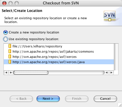 您在这里提供存储库的 URL。这只是一个普通的 http URL,如 http://svn.apache.org/repos/asf/xerces/java/。这一次单击