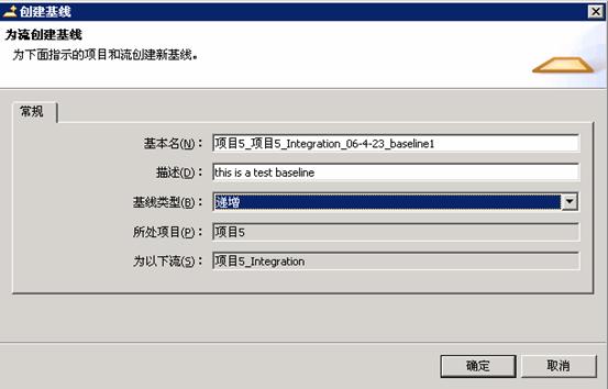 在弹出的创建基线窗口(图12),用户可以指定基线名称,添加对该基线的描述,选择基线类型(递增/完整)。该基线所属项目和流属于不可编辑内容。