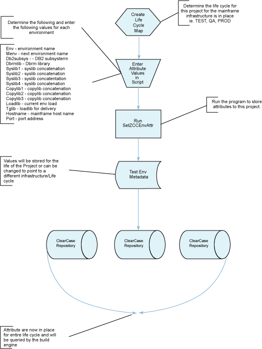 SetZCCEnvAttr.pl工具被用于更新ZCCENV属性,该属性局是在项目级别定义的。 它的功能是定义和描绘出主机上的z/OS基础结构和执行周期。然后这个数据被构建过程查询,用以决定在执行周期中该项目的位置,如何移动。如果在开发过程中需要作出改变或需要一个不同的迁移路径,Clearcase管理员只需改变ZCCENV的定义,因为这个项目用的是SetZCCEnvAttr.pl脚本。为测试和QA构建引擎利用这个新属性,在新的执行周期中继续进行或迁移到新的z/OS基础结构中。