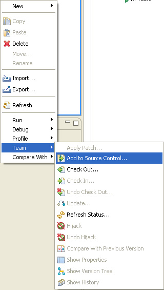 - 右击弹出内容菜单,(图 7)选择Team,然后点击 Add to Source Control。