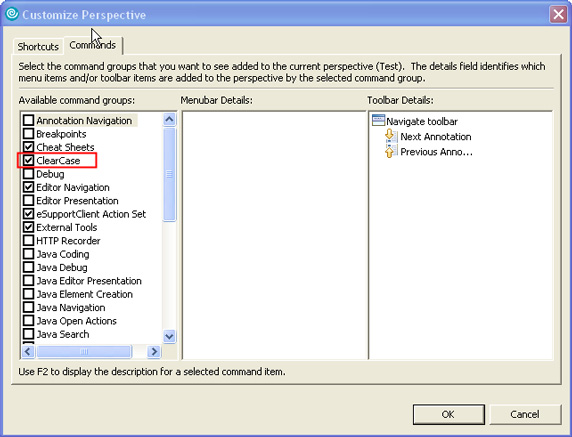 - 点击Commands标签,并选中 ClearCase (图 3)。