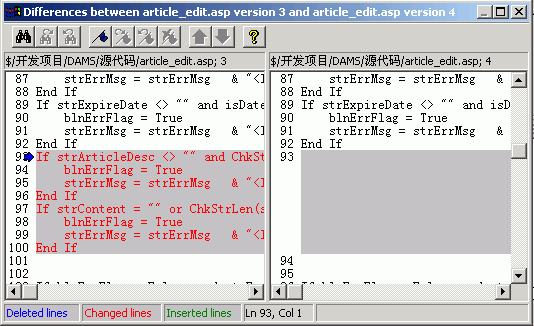 Diff:源码比较。单击该按钮会弹出源码比较选项对话框,直接单击"OK"按钮打开图1-18界面。从界面中可以清晰看到代码的异同。VSS中用3种颜色来区分代码的变化,蓝色代码表示被删除的行,红色代码表示被修改的代码,绿色代码表示新增加的代码。