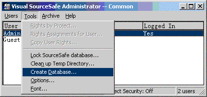 2、 在Visual SourceSafe Administrator窗口中,你可以看到Source Safe默认的两个用户Admin和Guest。如果你不打算使用默认的Common数据库,而要建立一个属于自己的项目数据库。选择菜单"Tools"——"Create