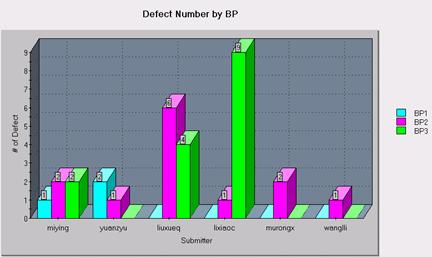同时该缺陷分析报告图完成。如图6所示,我们可以清晰地查看出各个提交人发现的不同优先级的缺陷的数量。结合测试人员的测试模块,能够据此评估各个测试人员的工作业绩。