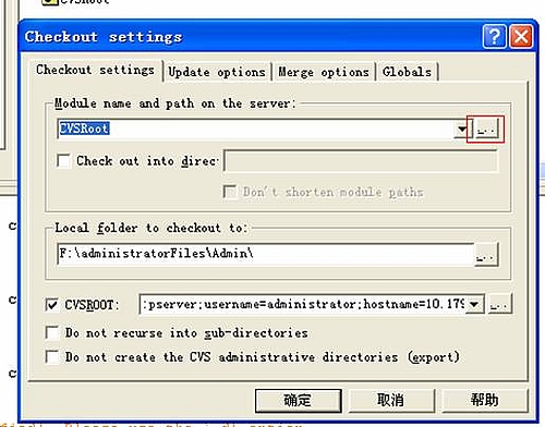 勾选参数cvsroot,点击按钮”…”,设置服务器连接参数: