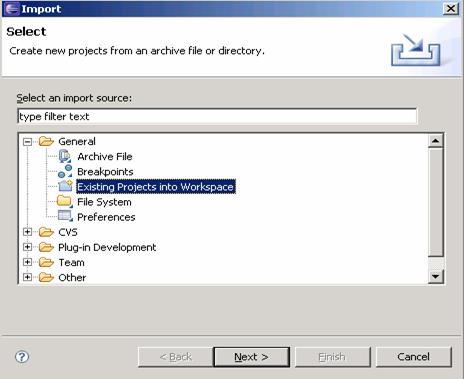 - 3) 在弹出的 Import 窗口中选择将已经存在的项目导入到工作空间(workspace)中