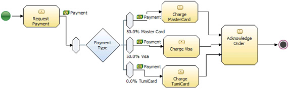 - 请注意,Payment Type 决策节点中添加了一个新的输出分支 TumiCard 以及一个名为 Charge TumiCard