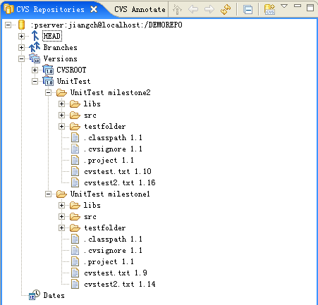 as Version...】,在随后出现的对话框中添加标签名即可。图29是对模块UnitTest建立了milestone1和milestone2两个标签后的结果。