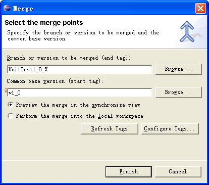 选择主分支工作拷贝的cvstest.txt,在其右键菜单中选择【Team】→【Merge...】,出现如图37所示的对话框。在"希望被合并的分支或标签"输入框中输入"UnitTest1_0_X";在随后的"通用基版本"