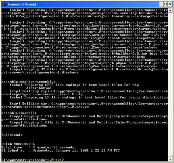 执行 Geronimo 的初始构建是很容易的。只需打开控制台,进入 <geronimo-install-dir>,输入