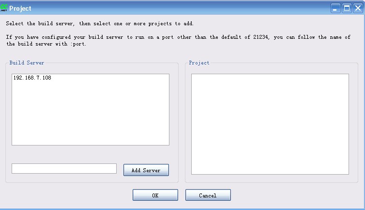 在下边的文本框中输入要监视的服务器,如果是默认端口号则不用输入端口号,否则需要“:”隔开输入端口号。如果添加成功,则会在右边的Project列表框中出现在当前ccnet服务器中存在的项目。OK返回到主窗口。