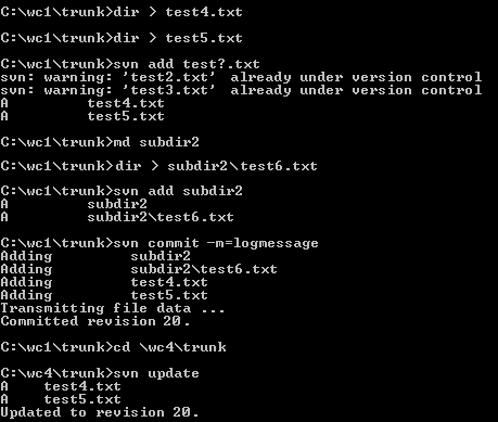 所有顶级目录的文件都回被拉入,但是没有子目录,当我在wc1将test4.txt和test5.txt添加到trunk,并添加一个包含目录的文件,然后提交。