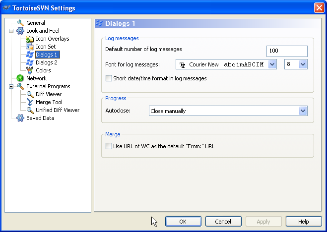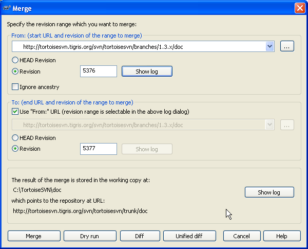选择版本范围最简单的方法是,点击显示日志,列出最近的修改和日志。如果你要合并单个版本的修改,直接选取那个版本。如果你要合并多个版本,就选择范围(使用通常的Shift-键)。点击确认,就会为你填写合并对话框的全部域,开始版本和结束版本。