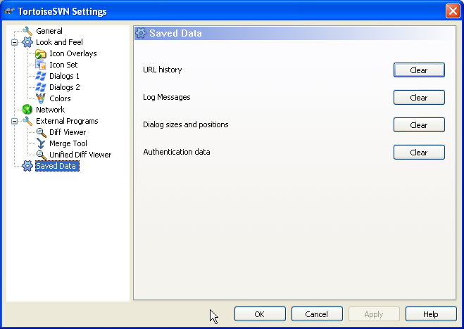 为您方便着想,TortoiseSVN保存了很多你用过的设置,并记录你最近浏览过的地址。如果你想清空这些数据缓存,就在这里操作。