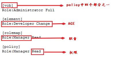 和 element。即 policy 用于定义每个 clearcase VOB 里,各种用户类型对于整个