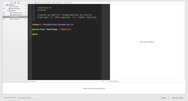 这一次,选中了5个有待提交的文件。第5个文件(显示在第1行)是项目的配置文件,是在添加新类时由 Xcode