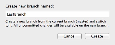– master > 新建分支New Branch… 菜单创建一个新的分支,取名为LastBranch。